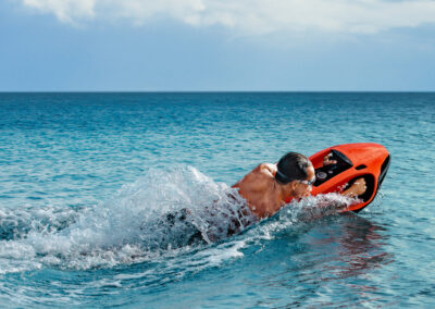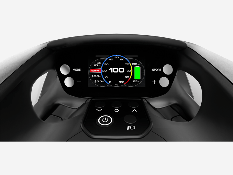 The SEABOB F9 boasts a digital thumb-operated accelerator. This is used to adjust the infinitely variable engine power to your needs. A switch sensor lets you switch between Normal and Dive mode. In Dive mode, the performance is much more sensitive for comfortable underwater travel.